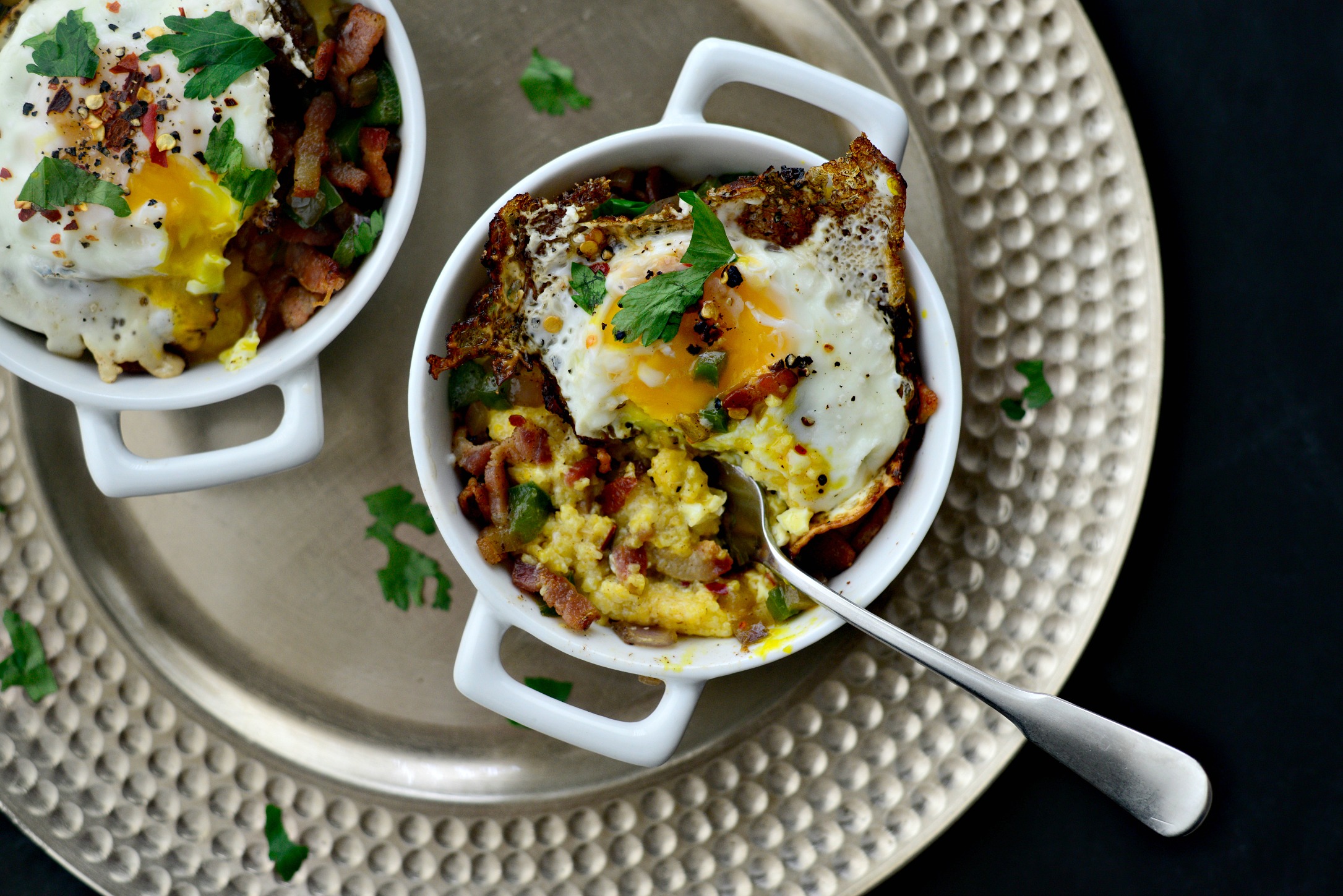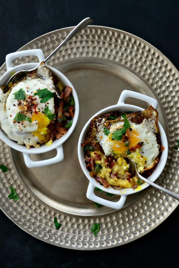 So I ate both of these bowls. I’m not proud but I was blissfully full. Full of creamy polenta, topped with sautéed green bell pepper and onions, crispy bacon lardons THEN (big gasp) a crispy-edged fried egg tops it off. And then you attack it with a spoon.
