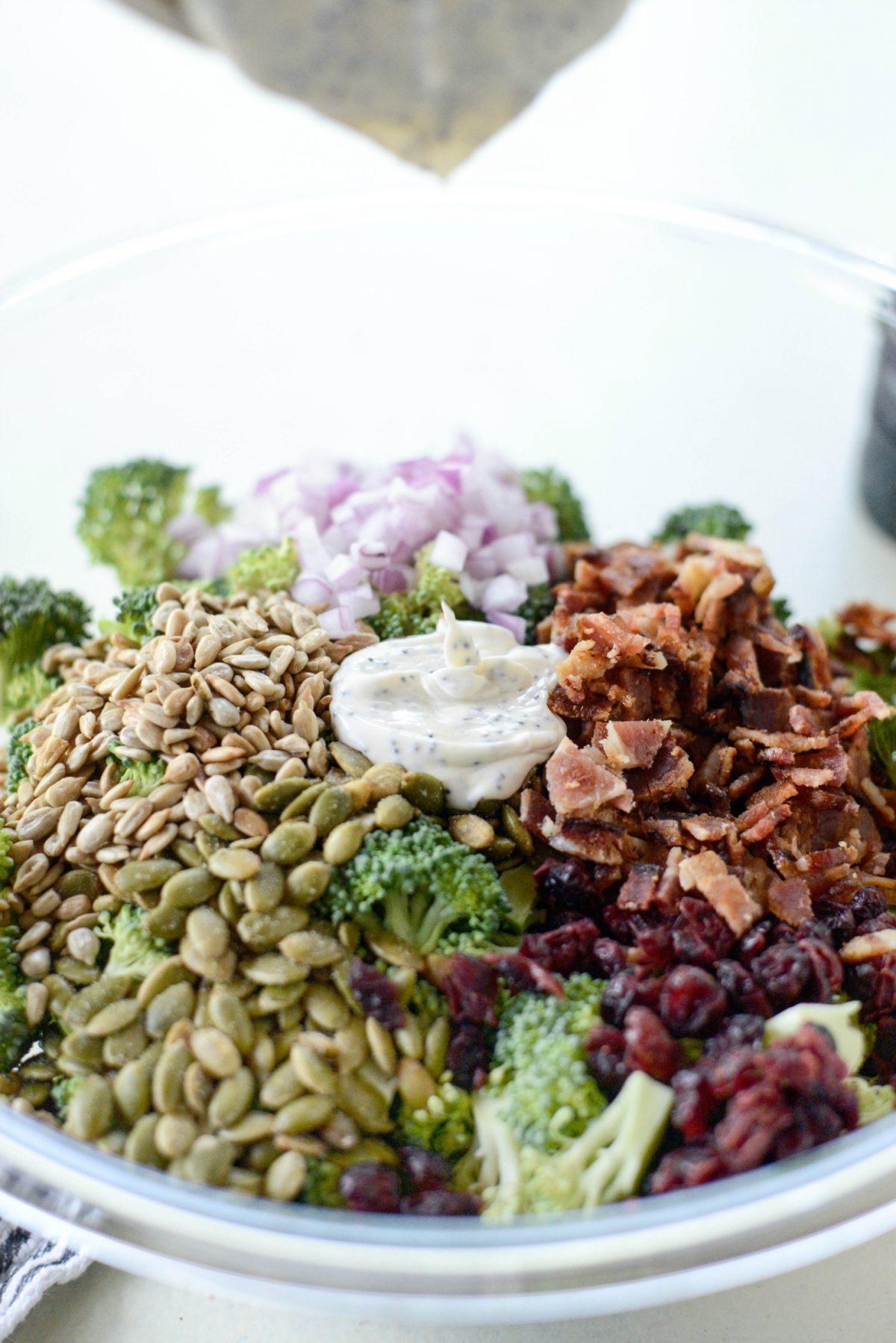 Prep, measure and add the broccoli florets from a large head of broccoli, 4 strips of cooked bacon that have been, 1/2 cup dried cranberries, 1/3 cup pepitas, 1/4 cup (unsalted) roasted sunflower seeds and 1/3 cup diced red onion.
