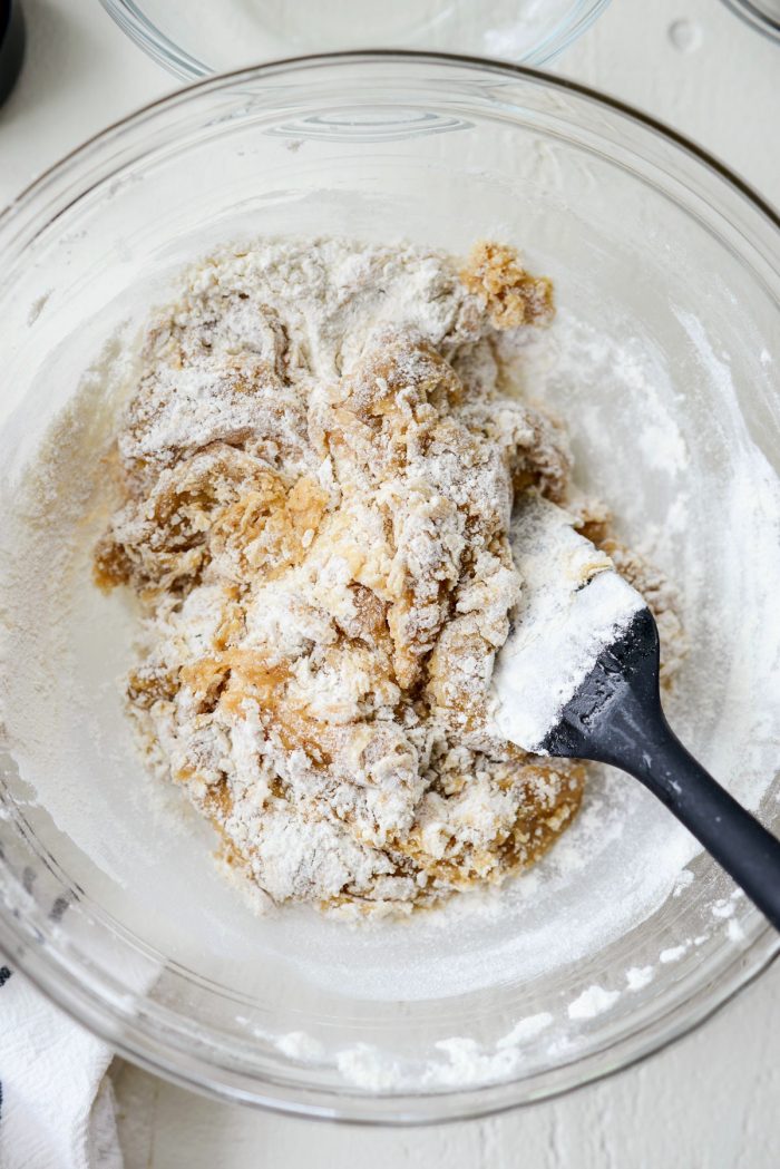 - Once the browned butter has cooled, add in the sugar, egg and vanilla. Use a rubber spatula and mix until combined.