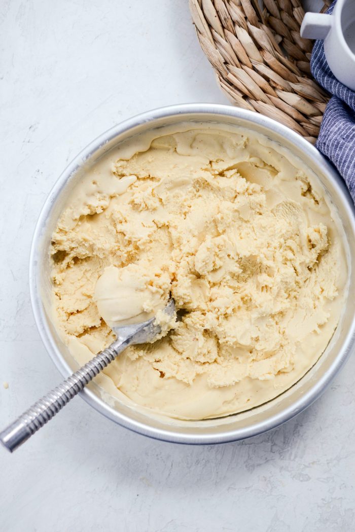 - Once the brown butter ice cream base has chilled completely, following the manufacturers instructions, pour the ice cream base into the ice cream maker and churn until thick.