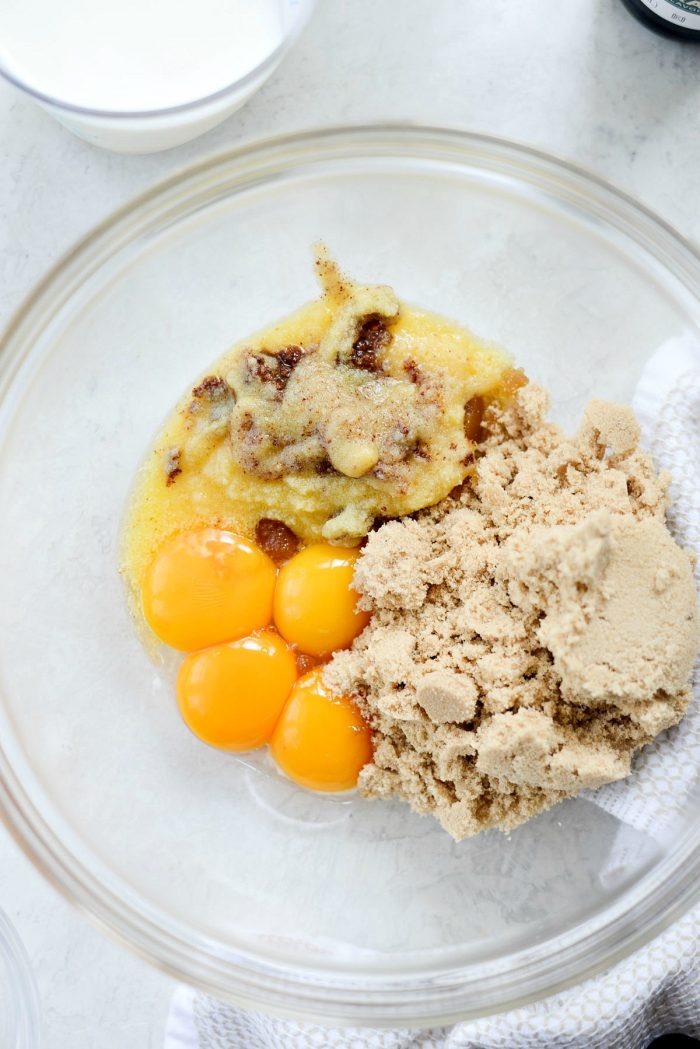 In a large mixing bowl, measure and add the (cooled) brown butter, 4 egg yolks and 3/4 cup light brown sugar.