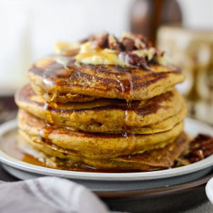 These pumpkin pancakes are thick and fluffy, perfectly spiced with just the right amount the amount of pumpkin flavor. You’re going to love them!