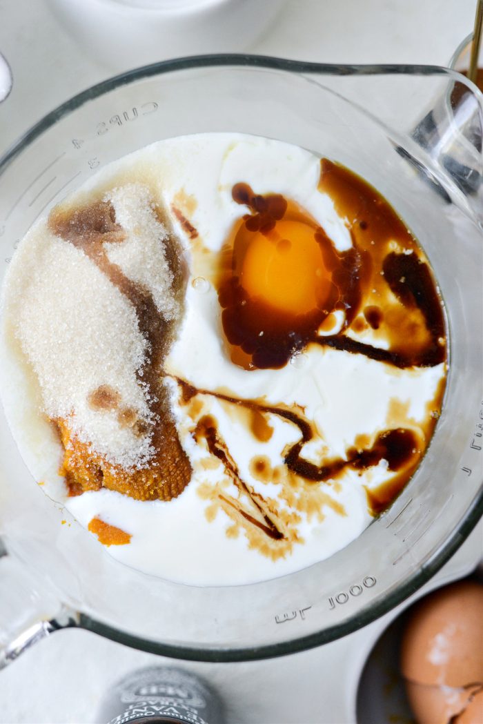 • In a separate medium bowl measure and add the buttermilk, eggs, pumpkin puree, sugar and vanilla. Whisk to combine