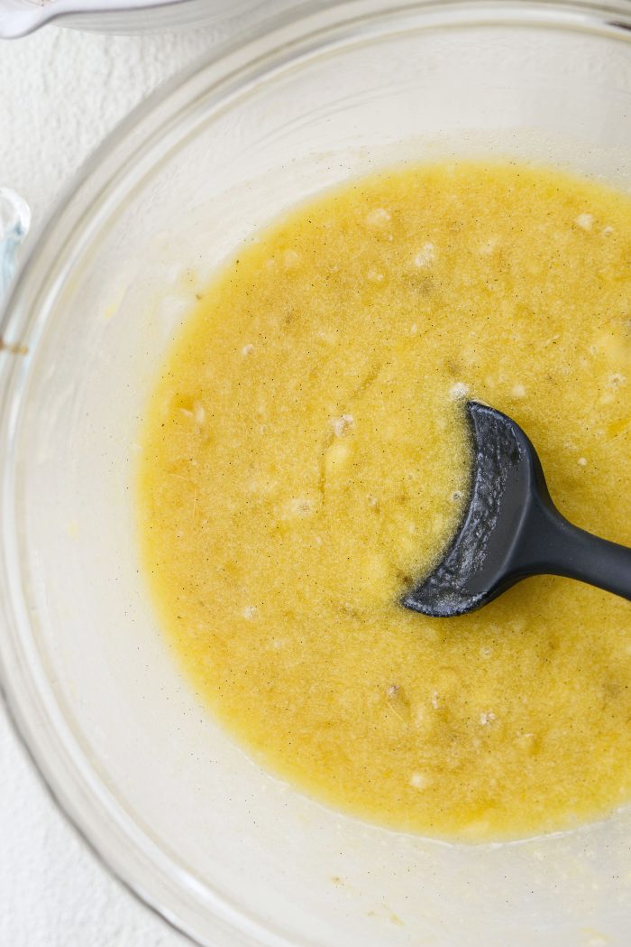 - In a large mixing bowl, add melted (and cooled slightly) unsalted butter, sugar, egg, vanilla and the mashed bananas. Mix by hand or use a hand mixer, stirring until combined and is light and creamy.