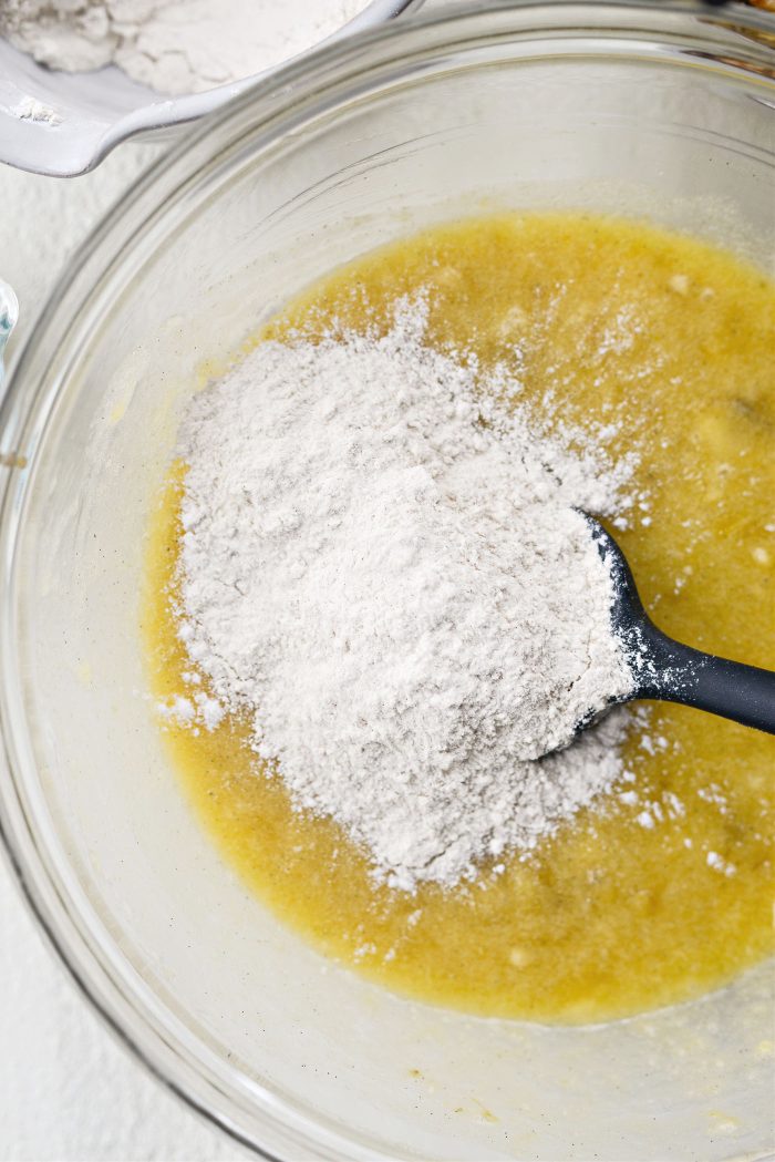 In a large mixing bowl, add 1/4 cup melted (and cooled slightly) unsalted butter, 1 cup sugar, 1 egg, 1 teaspoon vanilla (bean paste or extract) and the mashed bananas.