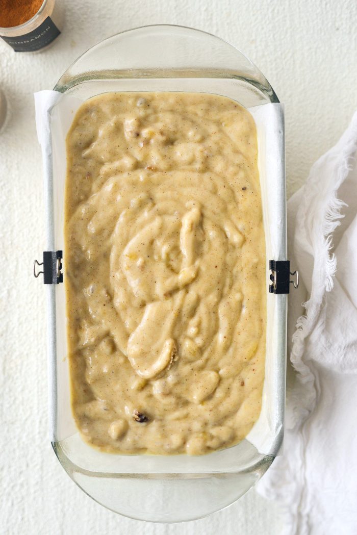 Line a standard loaf pan with parchment paper and grease with a nonstick baking spray with flour. For what it’s worth, I don’t always use parchment when baking banana bread.
