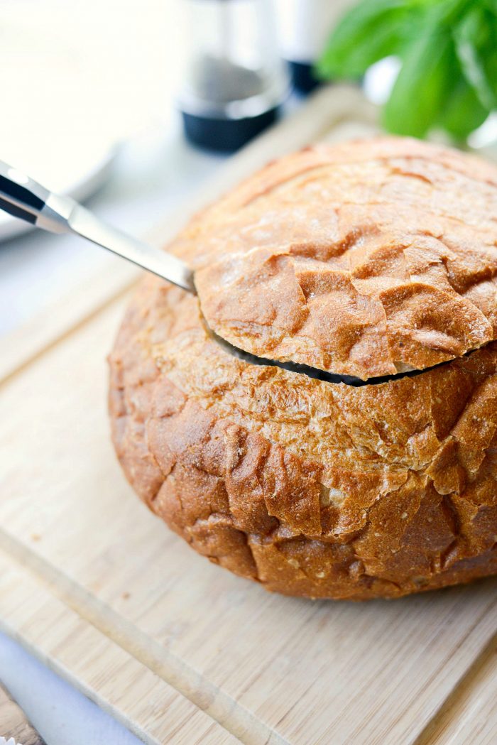 First, use a serrated bread or tomato knife and work at an angle to cut out the top of the bread. Sort of like when you remove the stem from a pumpkin. You will want this wide enough so you can fill the bottom.