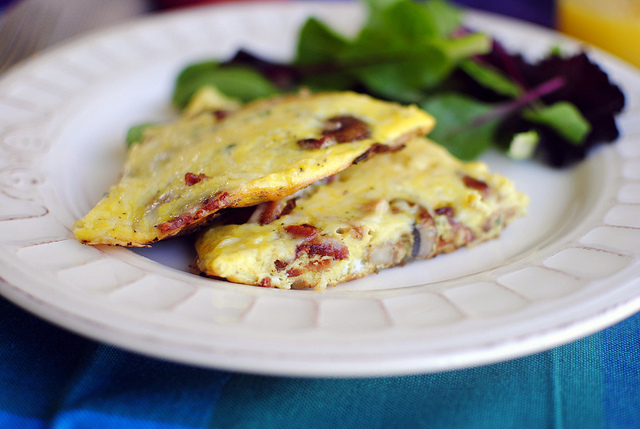 Oh the mushrooms, onions and bacon sound awesome together!! It looks perfect 🙂 I usually try to flip my frittata which does not always work well and makes me less inclined to make one but yours is perfect without the flip. I think one key is that you use less eggs and such than I do and that you start and keep the temperature low. I am going to try this soon! Thanks. Lovely photos, too!!