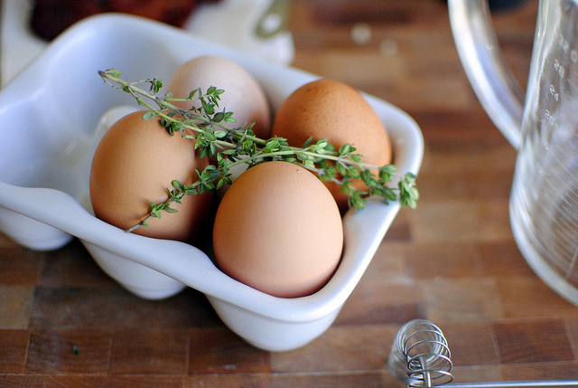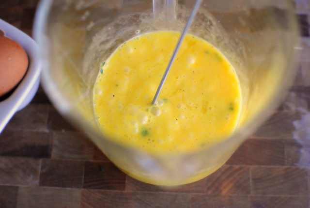 - Crack 4 eggs into a bowl or measuring cup. Add the fresh thyme leaves, black pepper and beat until completely combined and the eggs are light and thick.