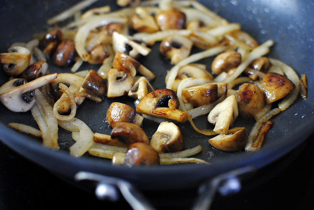 Once the onions/mushrooms are soft and starting to caramelize, sprinkle in the chopped bacon.
