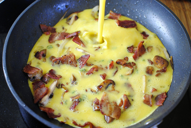 - Reduce heat to medium-low and give the pan a few minutes to cool down a tad, then add in the bacon and pour the beaten eggs over top. Sprinkle with the Gruyere cheese and cover the pan with a lid. Let the eggs cook until the center is set. About 8-10 minutes.