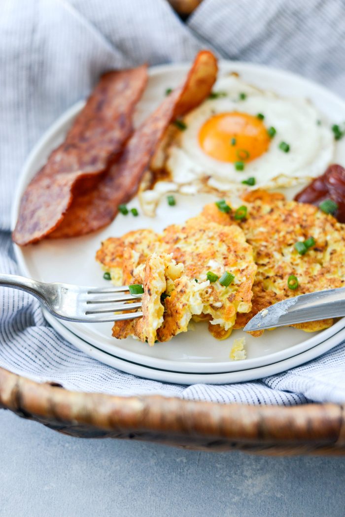Cauliflower Breakfast Hash Browns are a lightened up version of the beloved classic. Riced cauliflower is mixed with sharp cheddar and parmesan cheese and griddled until crispy. These make for a delicious breakfast side dish to eggs, bacon and toast.