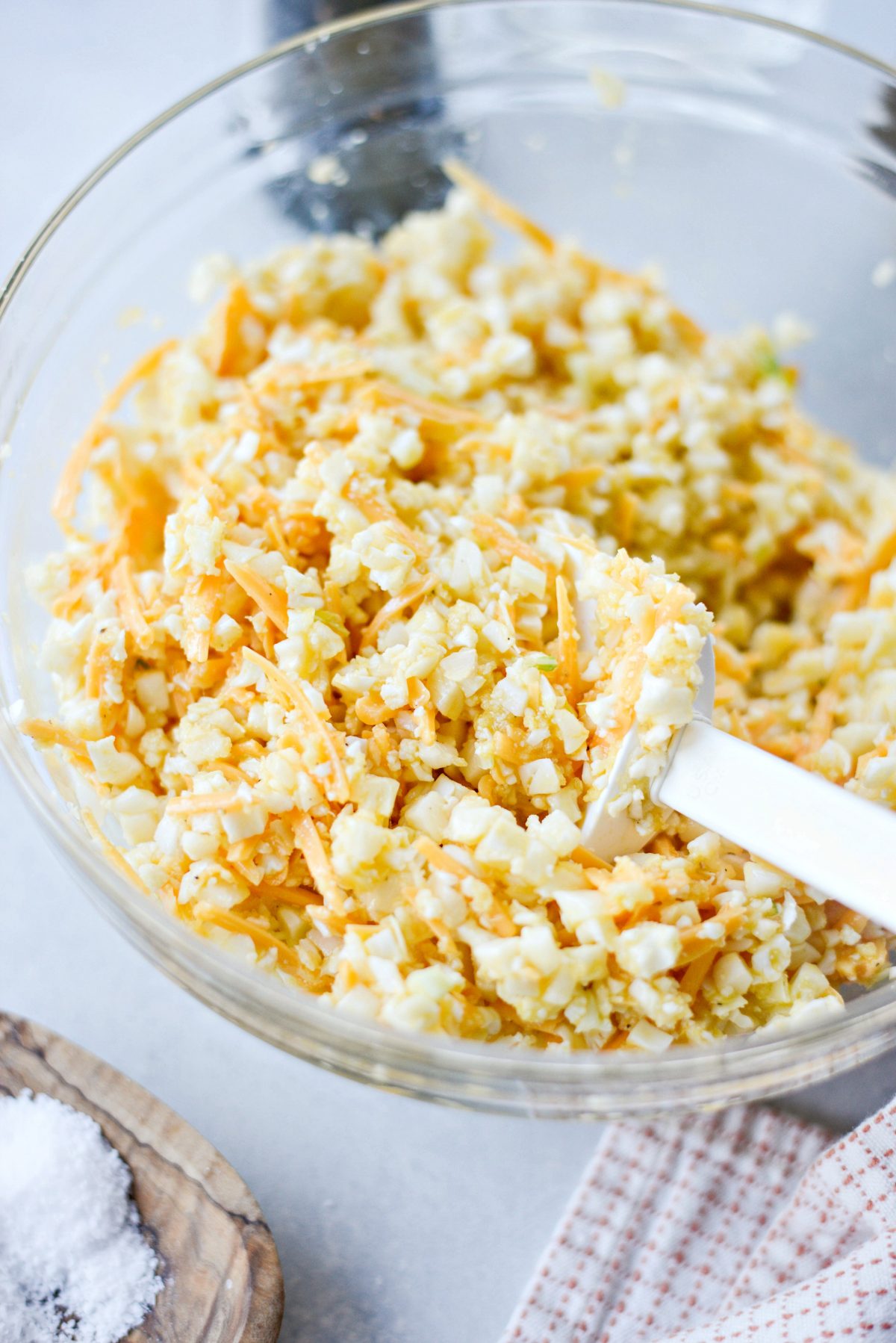 To keep this recipe on the easy side, I used pre-riced cauliflower pearls. Sometimes I don’t want to go through the hassle of lugging out my food processor and doing it myself. Then I just tossed the cauliflower with low-fat sharp cheddar cheese (regular is fine too!), parmesan, a little panko breadcrumbs, a few beaten eggs, salt and pepper.