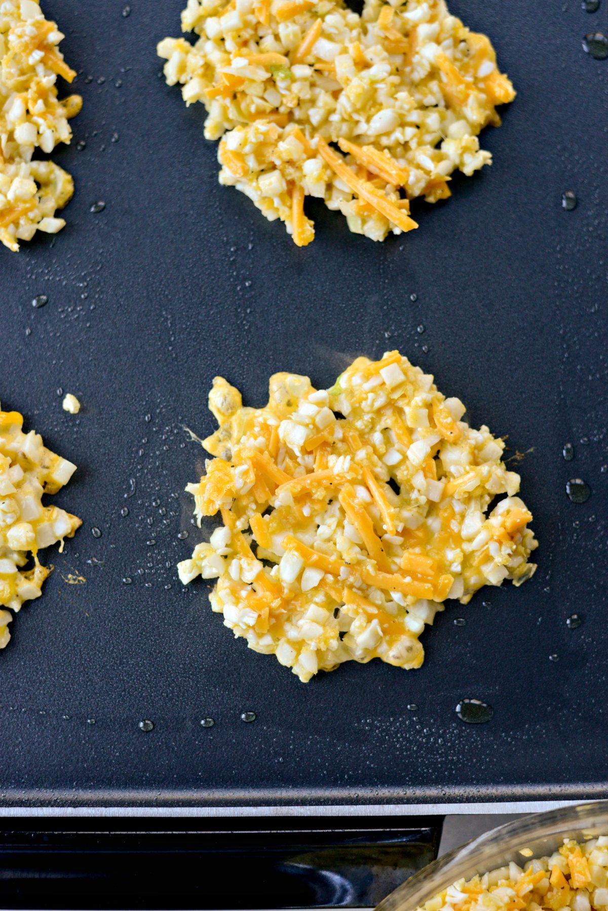 Then, using a 3-tablespoon scoop, measure out the cauliflower hash brown mixture and place on to your preheated 350° griddle that has also been lightly sprayed with olive oil.