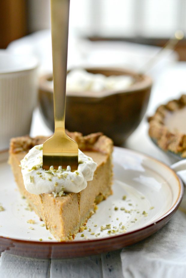 Lastly pour the pumpkin chai filling into your prepared crust. I used this pistachio toasted coconut pie crust… which is amazing but you can use any pie crust you choose.