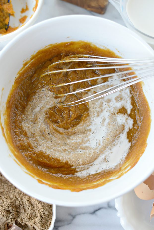 - In a mixing bowl combine the pumpkin, eggs, both granulated and light brown sugars, flour, chai spice and salt.