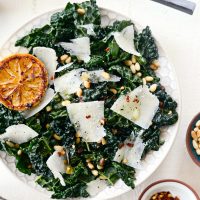 Finally squeeze the lemon over top and enjoy! The charred lemon along with the olive oil acts as a simple dressing for this kale salad and it’s phenomenal!