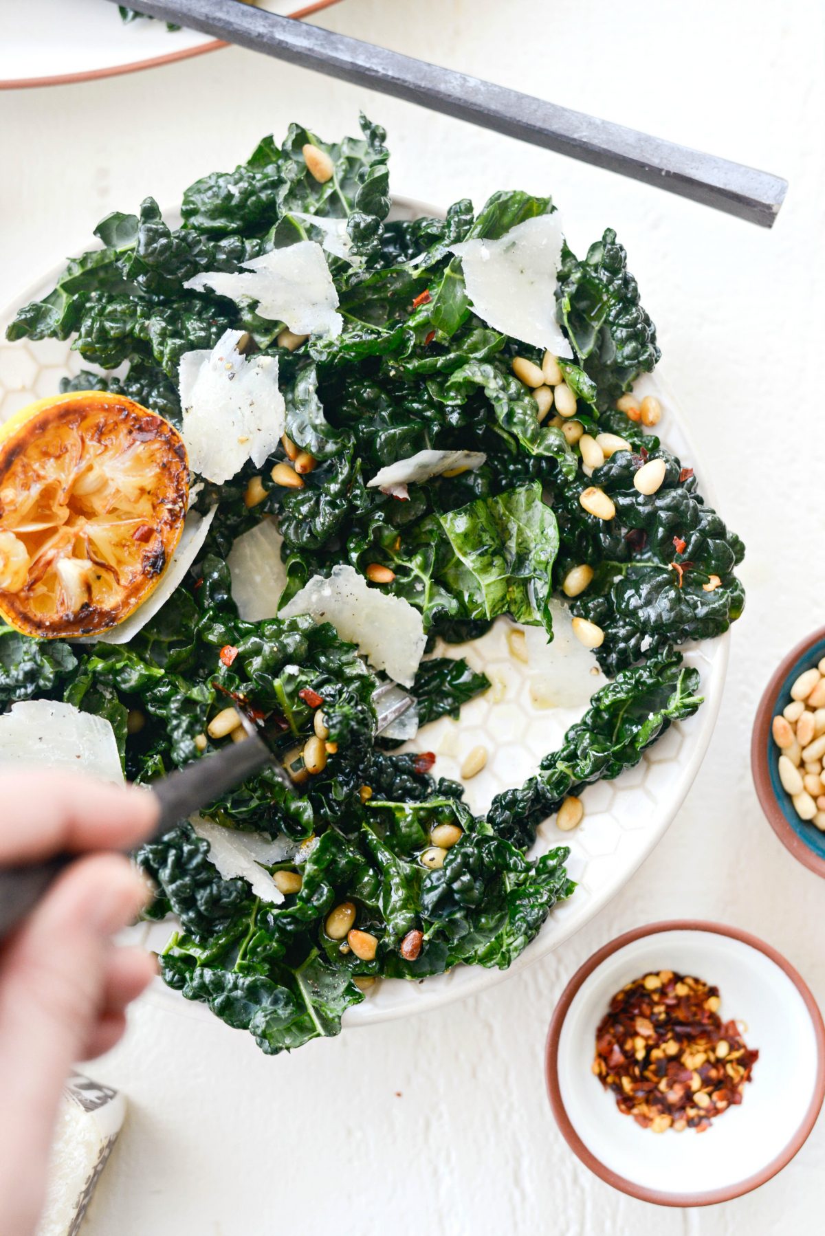 Charred Lemon and Tuscan Kale Salad! Tuscan kale is massaged with olive oil and salt, sprinkled with toasted pine nuts, shaved pecorino and red pepper flakes. A squeeze of charred lemon finishes of this simple yet impressive salad.