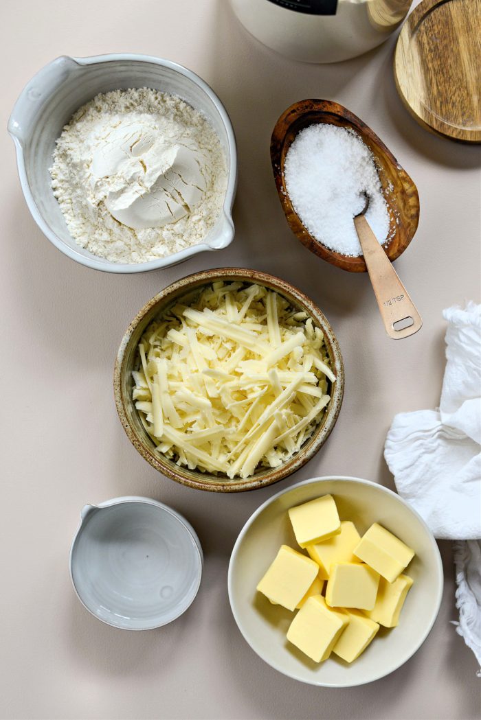 - In the bowl of your food processor add the flour, salt, butter and cheddar. With the lid on, pulse until large crumbles form.