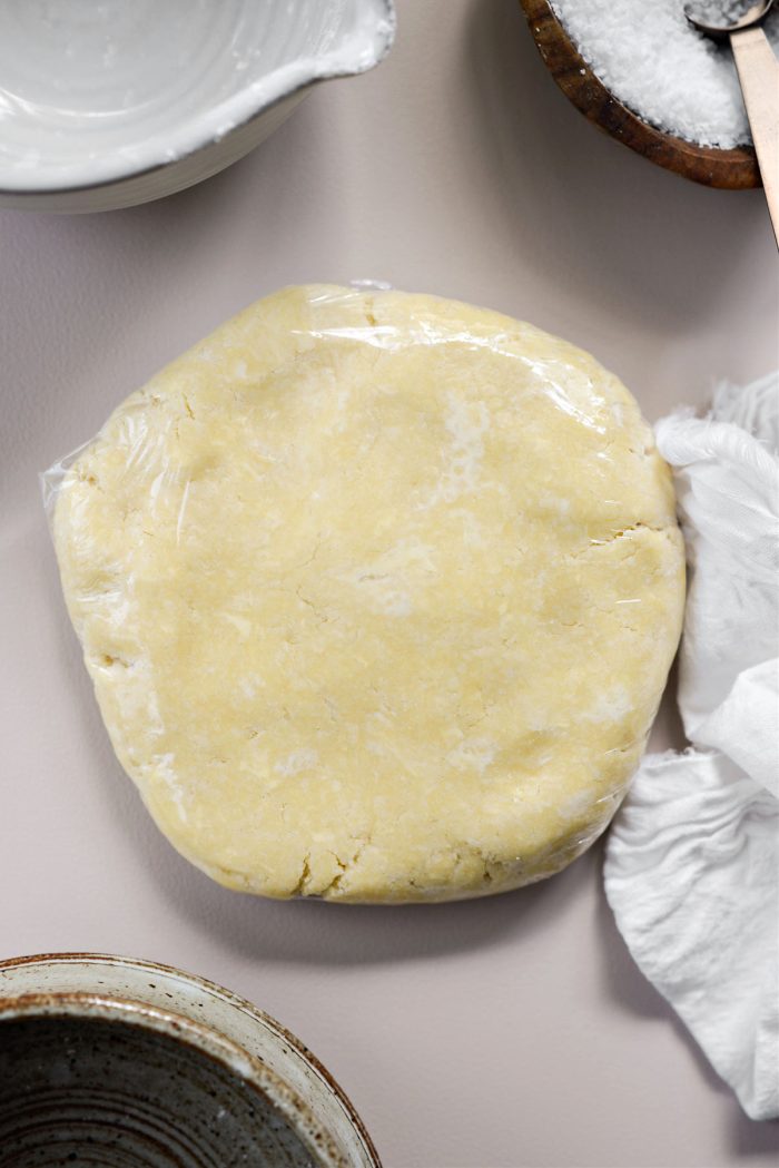 Form the dough into the shape that will fit your baking dish (round for pies or square for pot pie) and wrap in plastic or place into a quart-size re-sealable bag.