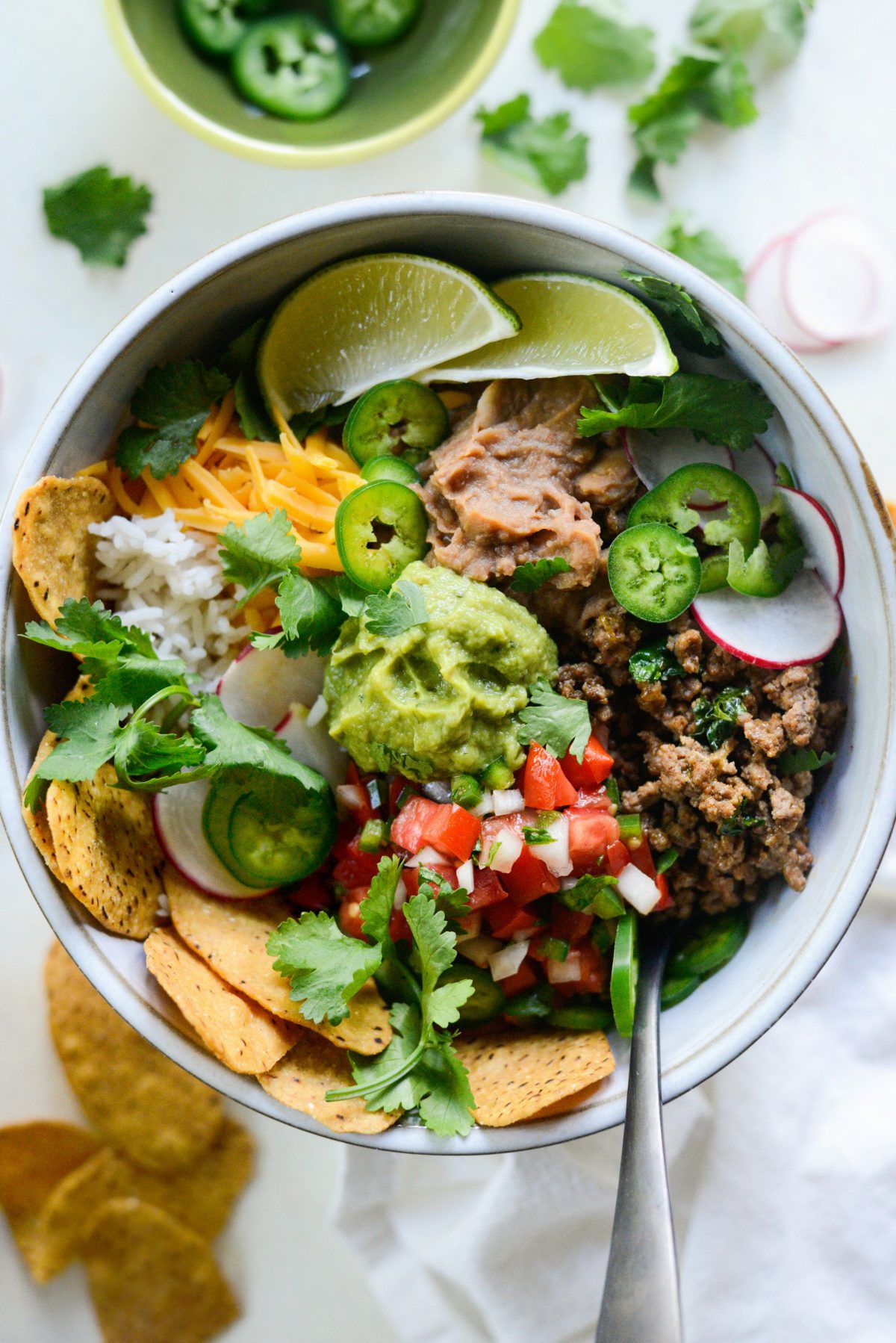 Literally, here is my bowl. In it you’ll find a few scoops of cooked white or brown rice topped with the above cheesy beefy mixture, refried beans, guacamole, pico de gallo, more sharp cheddar cheese, slices of fresh radish and jalapeño. Other optional toppings are sour cream, hot sauce, pepitas, pickled jalapeños, green onions and even grilled corn.