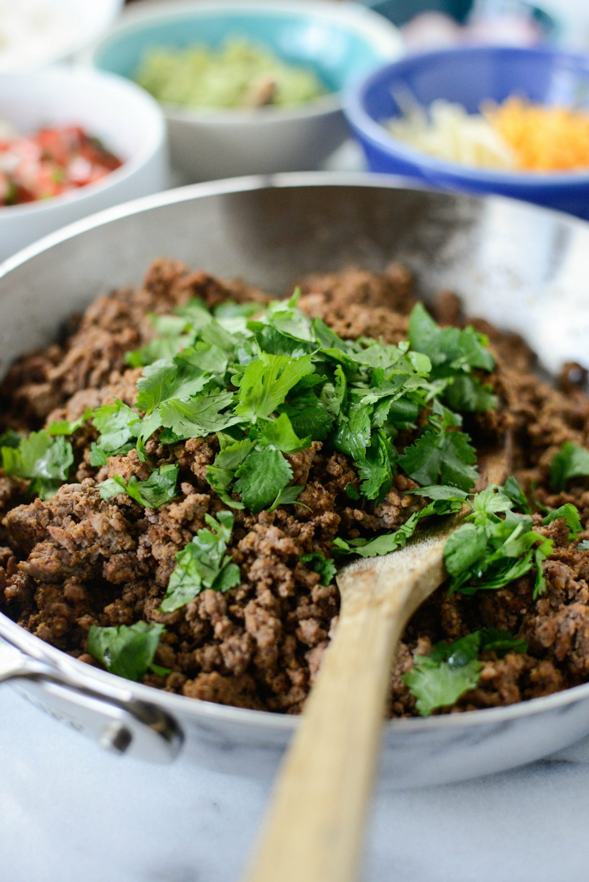 - Preheat a skillet over medium. Brown ground beef until no longer pink and fully cooked. Add seasoning, cilantro and cheese. Stir until the cheese is melted.