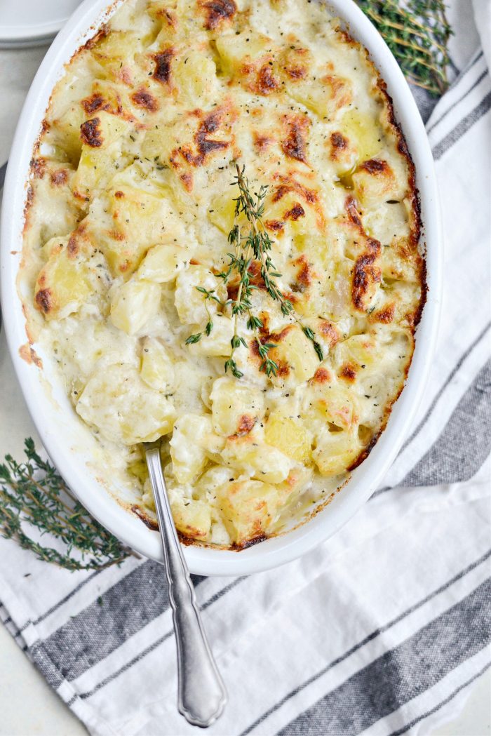 This holiday season, step up your side dish game by making these Cheesy Gruyere Potatoes! Yukon gold potatoes are tossed in a homemade sauce of shallots, garlic and thyme and LOTS of gruyere cheese. Baked until golden and delicious. Serves 8 to 10 (depending).