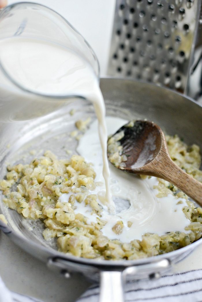 Next, while stirring, pour in 1/2 cup of whole milk and 1/2 cup of low-sodium chicken broth.
