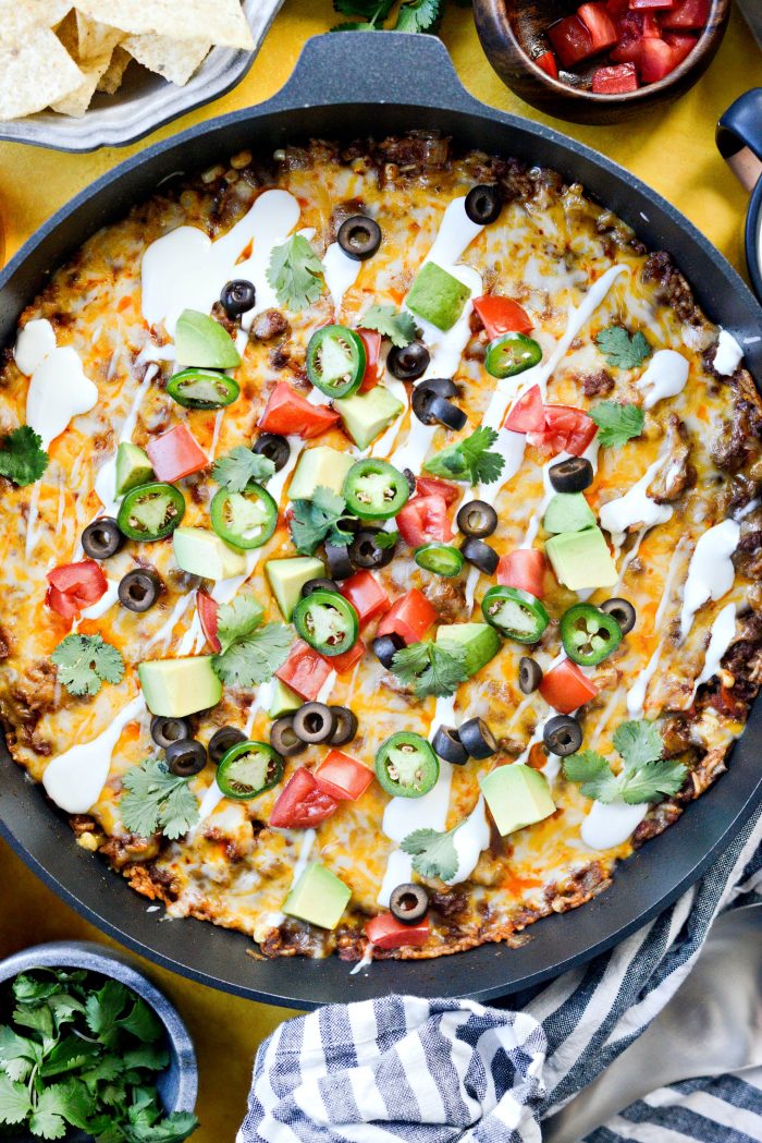 Finally, serve this skillet meal with sour cream, diced tomatoes, avocado, cilantro and sliced olives if that’s your thing. Although olives aren’t technically a Mexican topping it’s most definitely my thing and I love adding them to nachos, tacos and this cheesy Mexican beef and rice skillet.