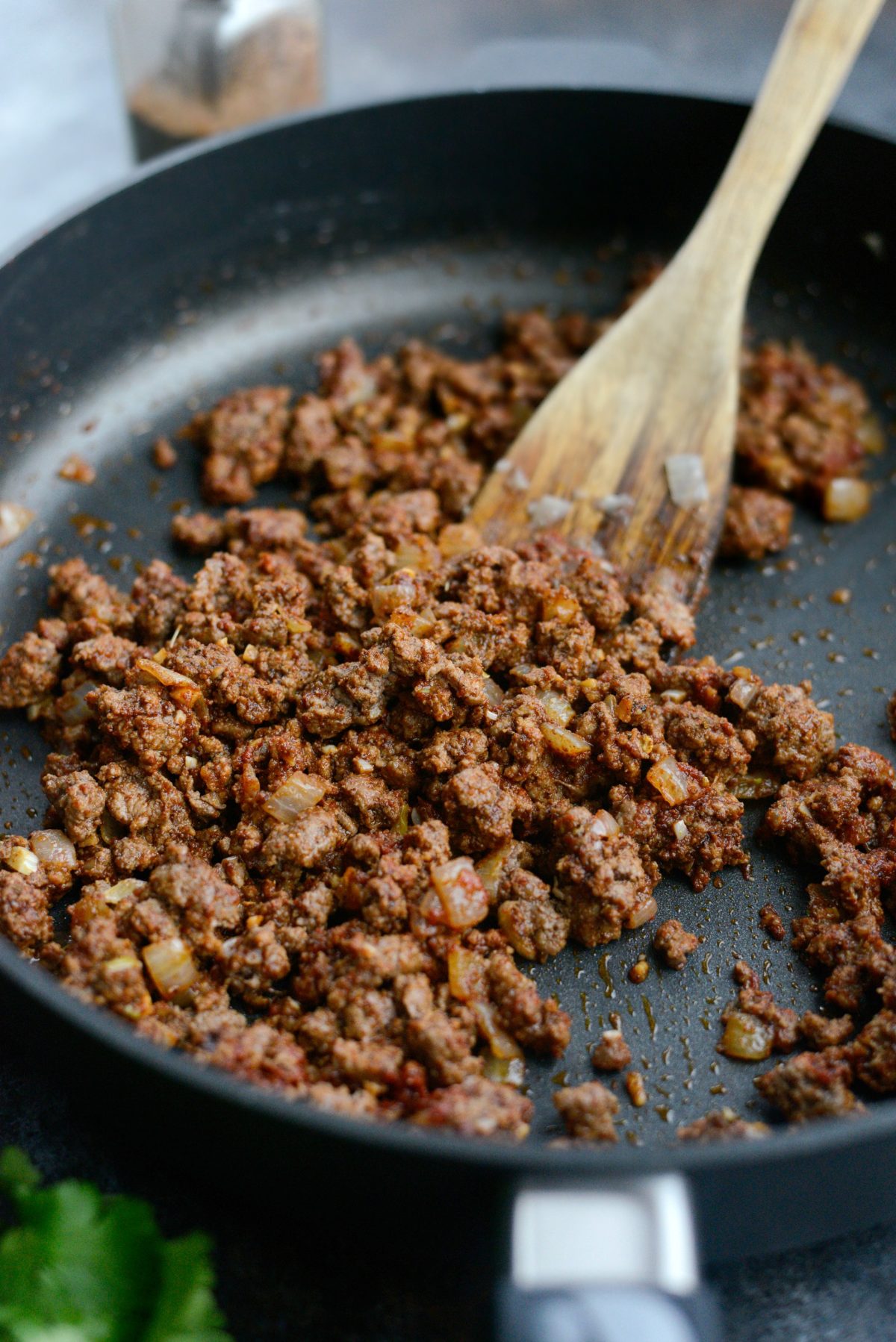 In a 12-inch, deep-sided skillet, sauté 1 small diced onion in 2 teaspoons olive oil over medium-low heat until tender, about 5 to 8 minutes. Next add in 2 minced cloves of garlic and cook for 1 minute. Then add in a pound of lean ground beef and cook until no longer pink, about 10 minutes, then drain off any excess fat.