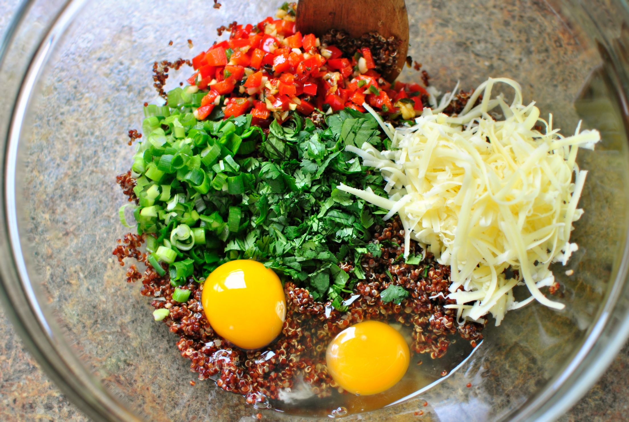 - In a large bowl combined the cooled quinoa, green onions, cilantro, {cooled} peppers and garlic, two eggs and 3/4 cup grated cheddar cheese. Stir to combine.