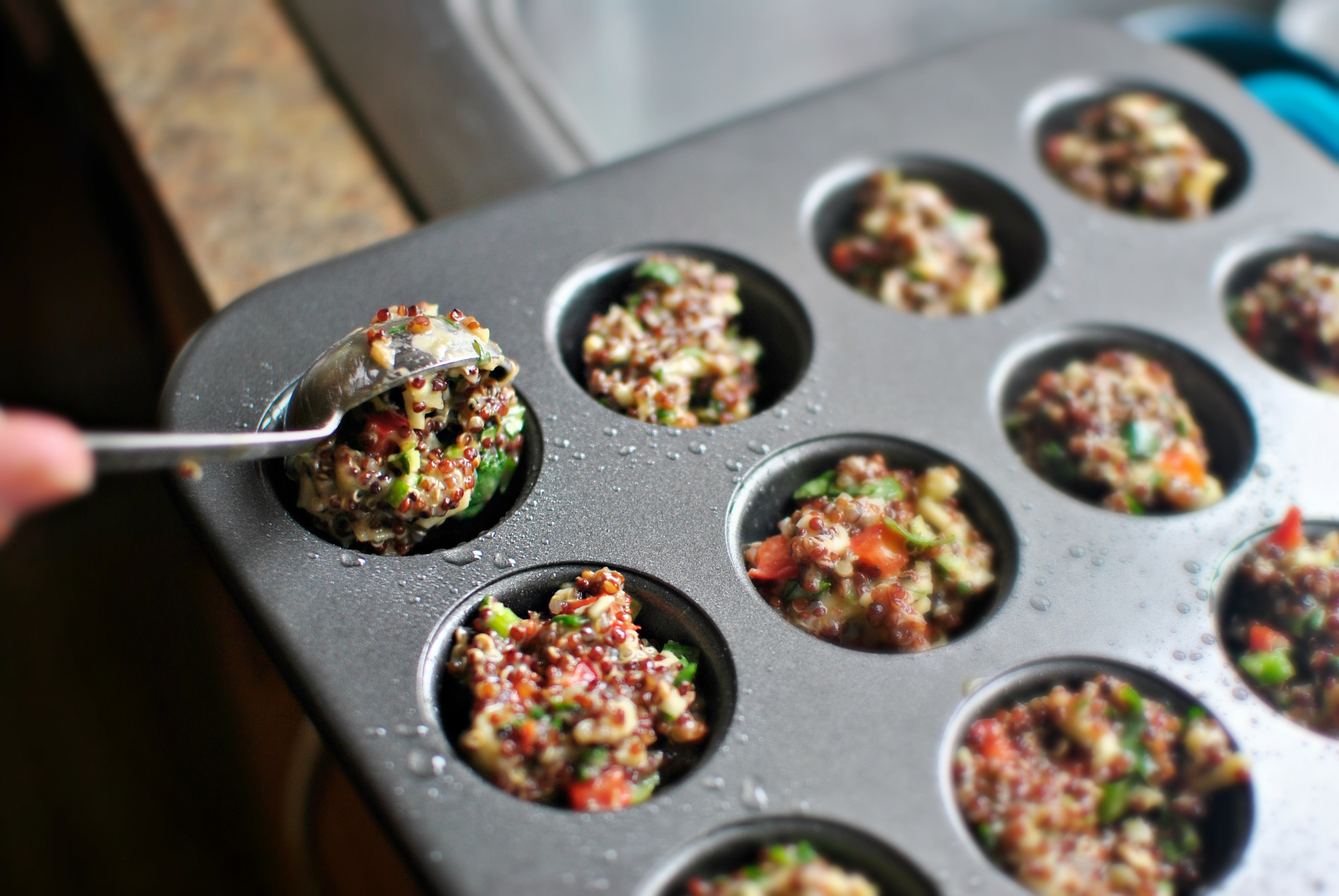 - Lightly grease a mini muffin pan with baking spray. Spoon heaping tablespoons of the quinoa mixture into each muffin spot. Top with remaining cheddar and pop into a preheated 350 degree oven for 15-20 minutes.