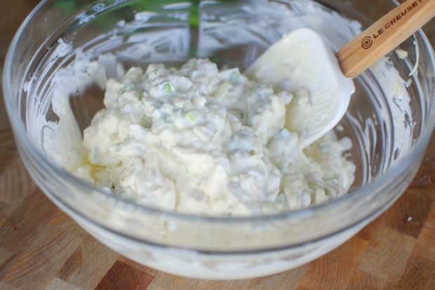 - In a large bowl combine; mayo, Greek yogurt and cream cheese until silky smooth. Add in the cup of grated Jarlsberg, sliced green onions, finely diced shallots, smashed garlic, salt and pepper. Stir to combine.