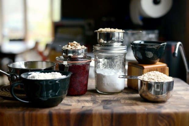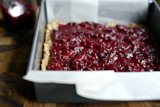 First of all I cut down the sugar in the chewy oatmeal bar. And because the cherry jam is naturally sweet it adds the perfect touch of sweetness and picks up where the brown sugar oatmeal cookie-ish bars leave off.