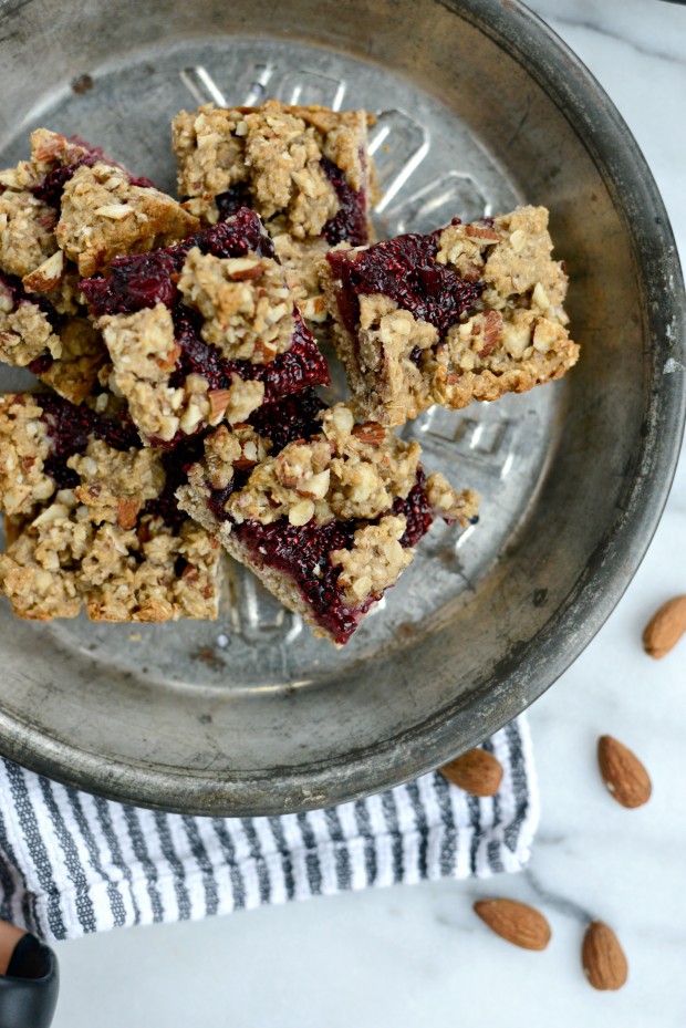 - Spread the jam onto the bars and spread, leaving a small border. Drop small clusters of the almond-studded dough on top of the jam bars and then slide back into your oven to bake for an additional 18 to 20 minutes, or when the almond crumble is lightly golden brown.
