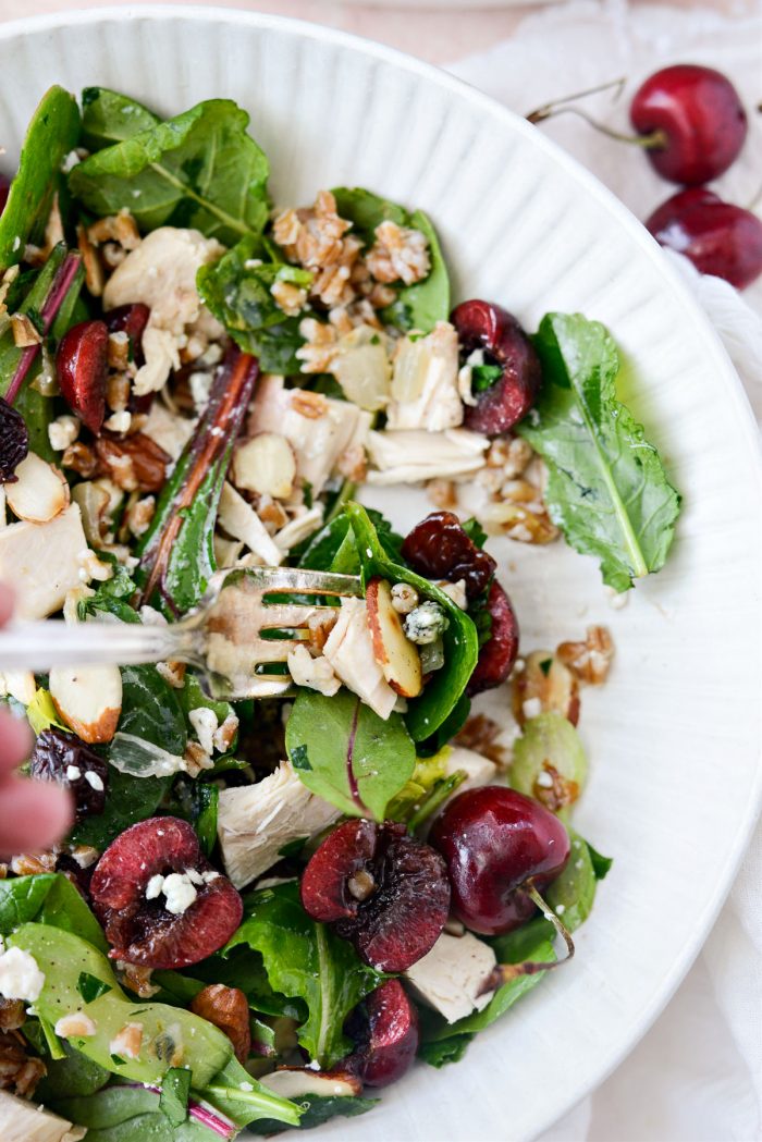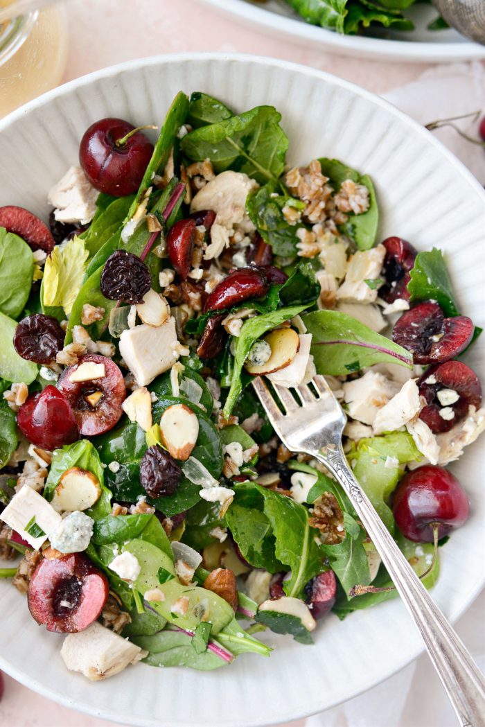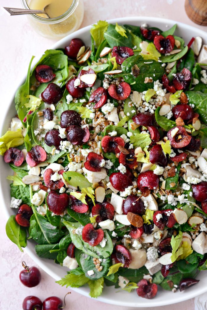 - Top with pitted and halved cherries and drizzle with desired amount of dressing.