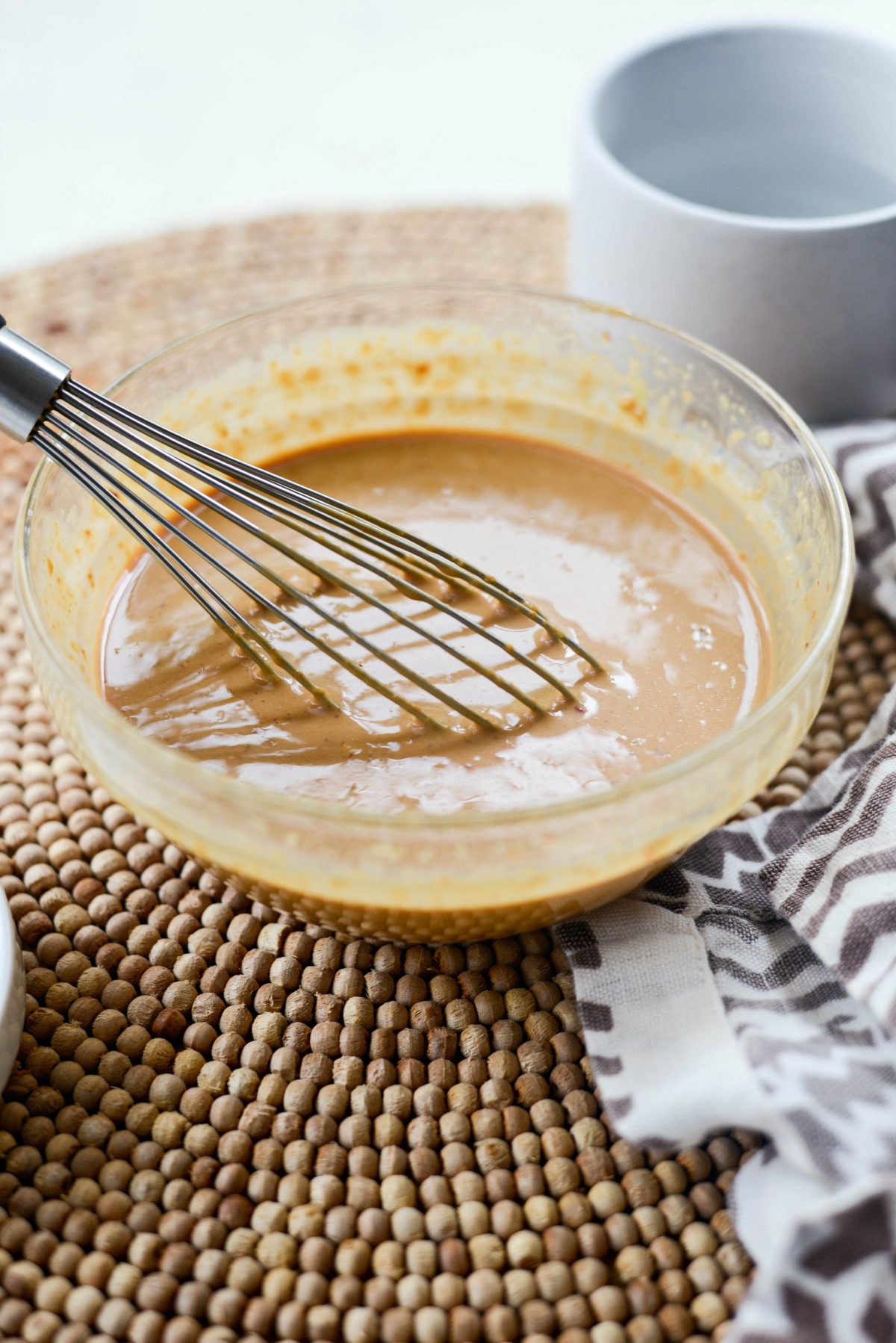 In a mixing bowl, add 1/2 cup smooth peanut butter – use your favorite, 2 tablespoons coconut aminos (or low-sodium tamari), juice of 1/2 a lime, 1 teaspoon rice vinegar, 1 tablespoon sambal oelek [chili garlic paste], 1 teaspoon grated fresh garlic, 2 teaspoons both grated fresh ginger and lemongrass, 1 to 2 tablespoons hot water. Mix until combined throughly, only thinning out with enough hot water until it reaches a desired consistency. And then set it off to the side.