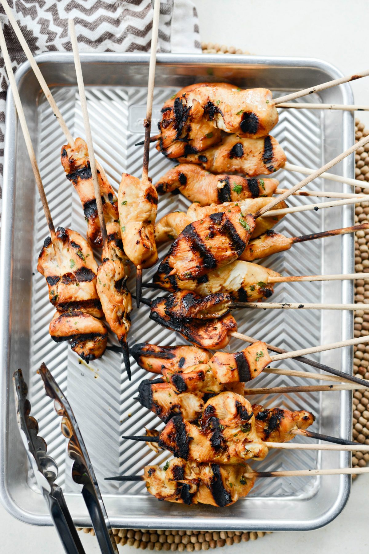 We’re weeks away from summer officially starting and our grill has been used most nights of the week. Grilled wings, burgers and brats, and today it’s satay. I’m a huge satay fan. What is it about grilled meat on sticks that you get to dip into a creamy peanut sauce that’s so satisfying? And one of my favorite recipes is this beef satay, but it’s made by cooking in a hot oven. However it’s about to be too hot to turn on the oven and grilled chicken skewers not only look more appetizing, but the kiss of the grill only adds another layer of flavor.