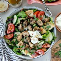 Two of my sisters, Kelly and Julie turned me on to this salad and it’s so unbelievably delicious. It has a rainbow of vegetables and the warm chicken pieces on top with the cool salad is my absolute favorite thing. It’s just SO SO GOOD! I think part of it has something to do with the amazing dressing and the other part is that garlic sauce. And of course the toasty pita pieces are too shabby either.