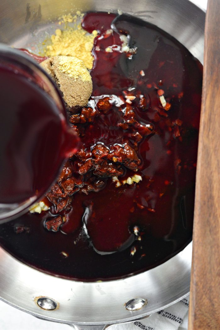 - Next add in chipotle peppers, adobo sauce (from can of chipotles), tomato paste, molasses, brown sugar and dried mustard. Lastly, pour in pomegranate juice and squeeze in the lemon juice.