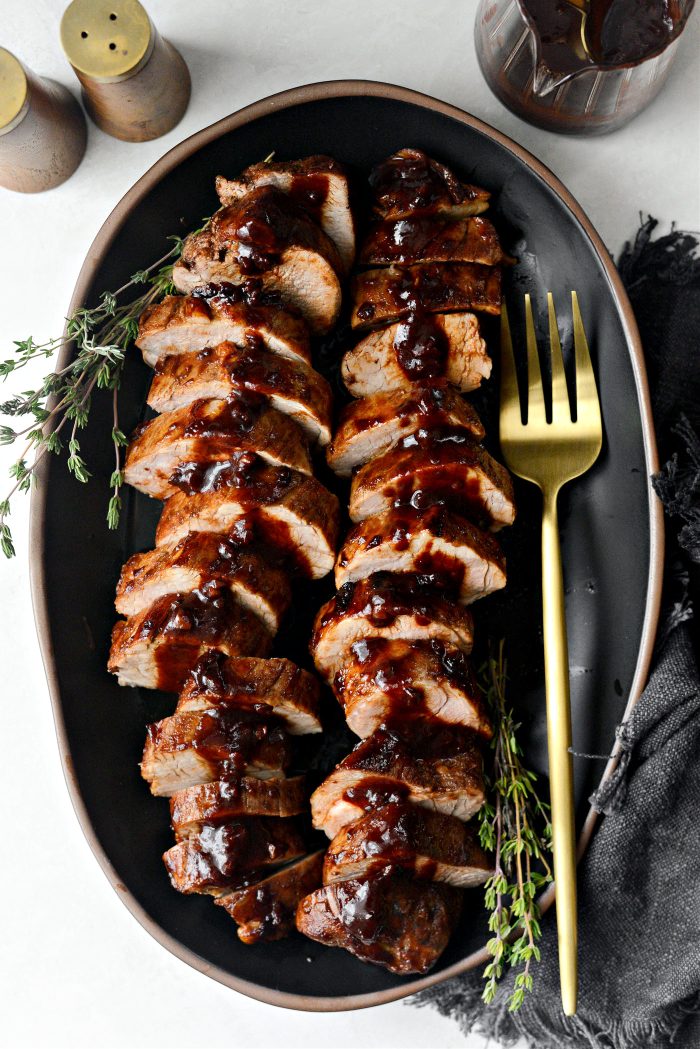 Seared pork tenderloins are brushed with a simple, homemade chipotle pomegranate glaze and roasts in a hot oven until perfectly cooked. It’s sweet, smoky with the perfect amount of heat. And not only is this recipe perfect for a. cozy week night meal, it’s also special enough to serve at your holiday table. Simply serve with your favorite sides and you have an incredible. and impressive meal with little effort. I’ve gone ahead and linked some of my favorite sides to serve with this at the end of the post.
