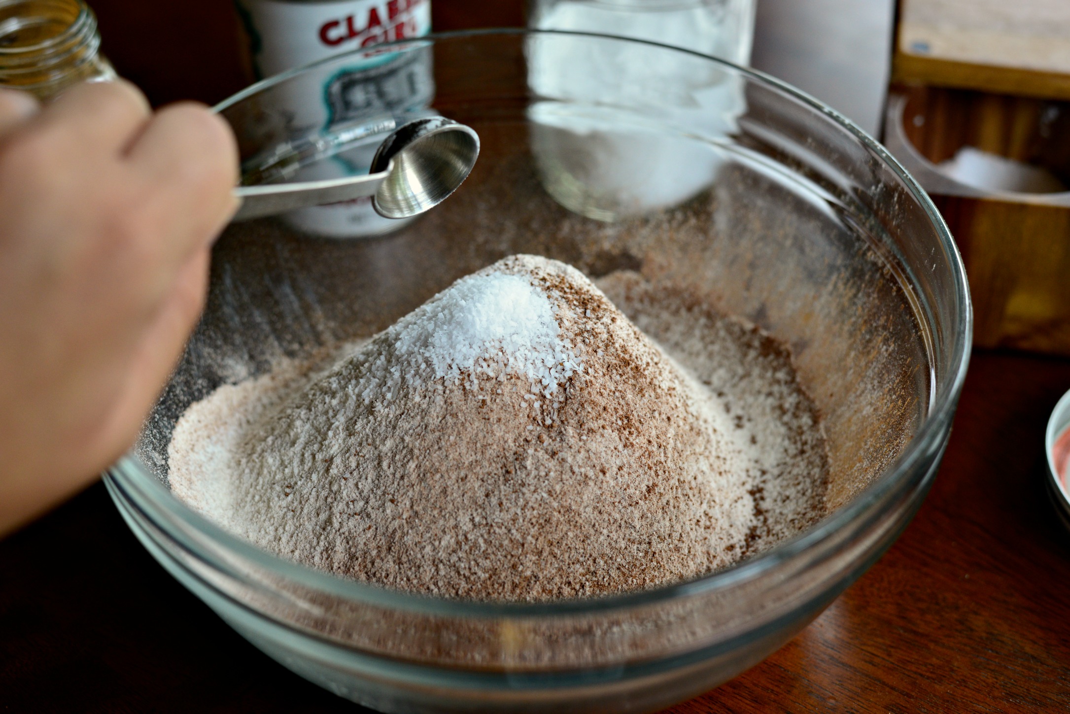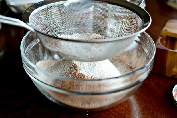 In a large mixing bowl add 2 cups unbleached all purpose flour, 1/4 cup natural cocoa powder (not Dutch process), 1 tablespoon cinnamon, 2 teaspoons of baking soda, 1 teaspoon fine salt and 1/4 teaspoon baking powder. Whisk well to combine.
