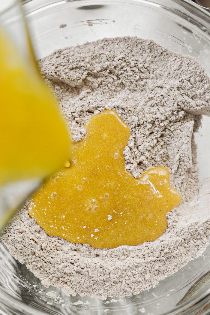 - Pour the wet ingredients into the bowl with the dry and mix until just about incorporated.