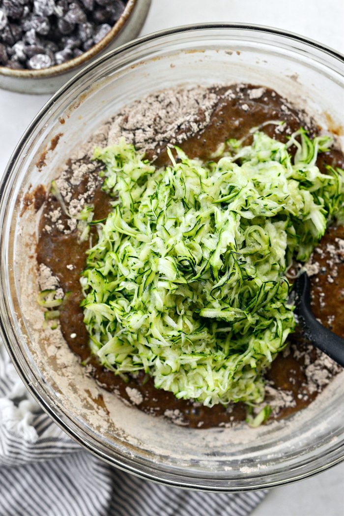 Add in the 2 cups of grated zucchini and mix until just about incorporated.
