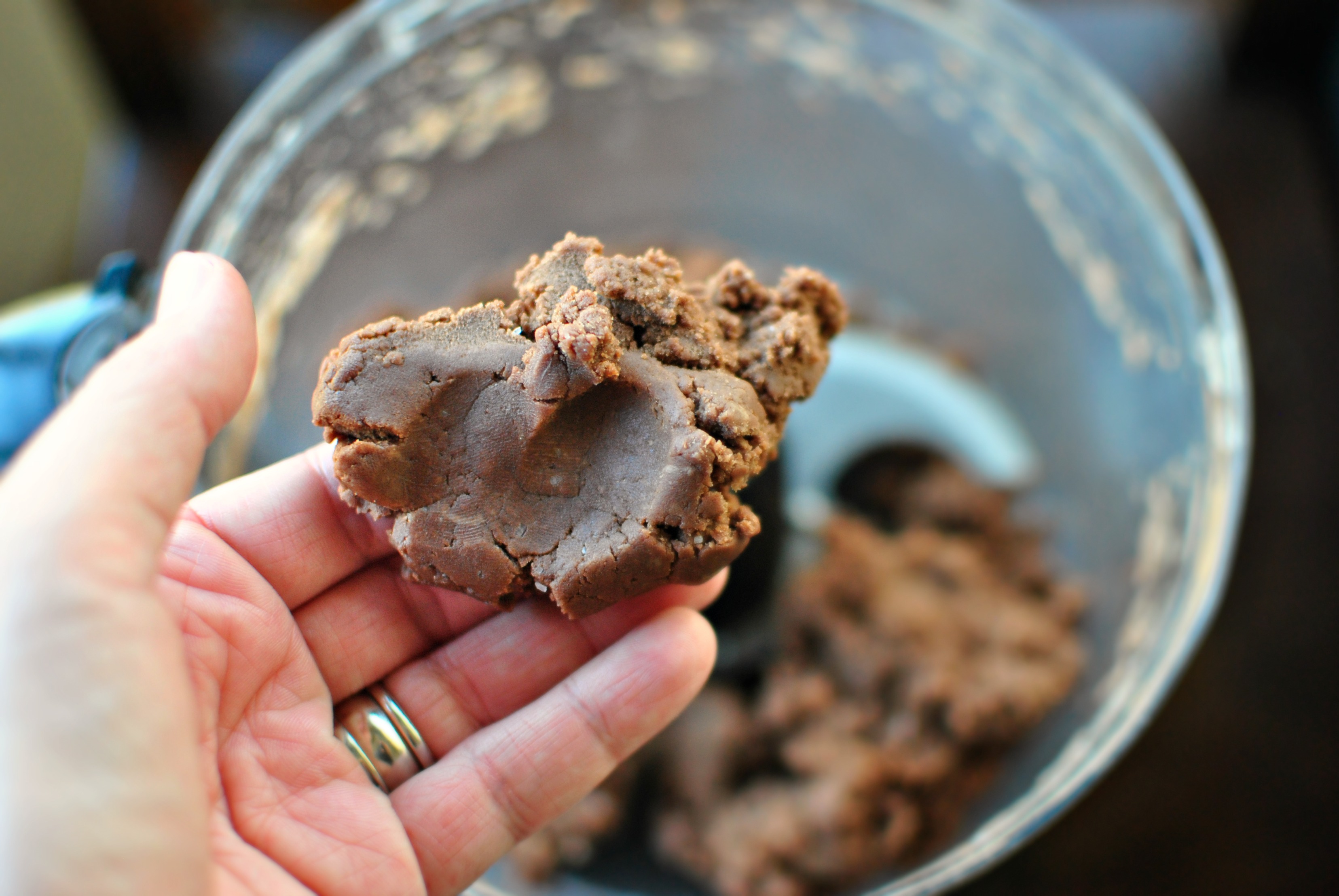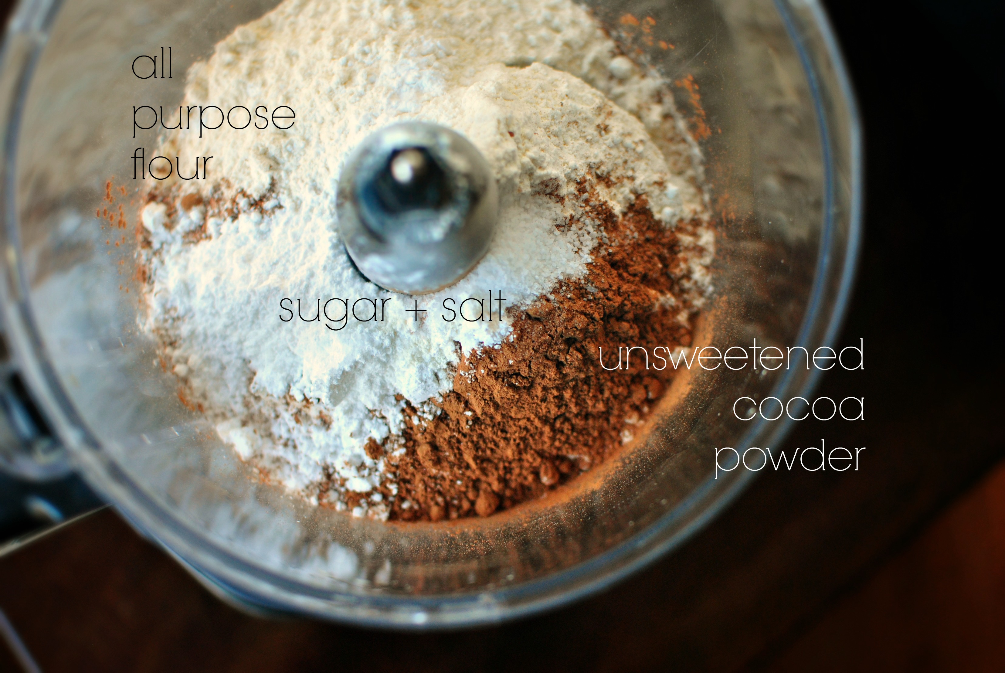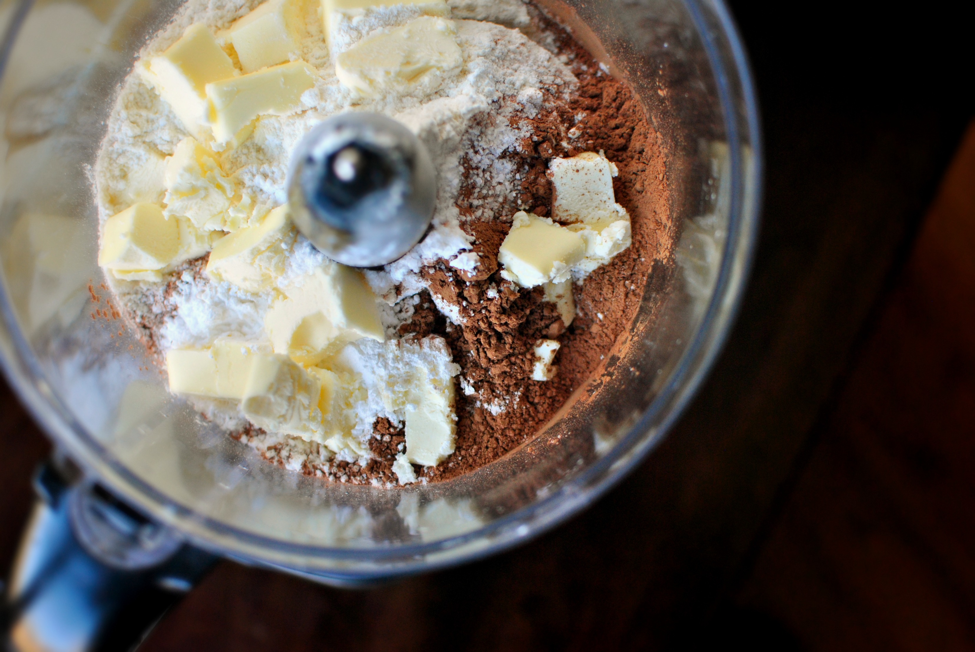 - Combine the flour, cocoa, sugar, salt and butter into a food processor and pulse until it's crumbly. Next add one tablespoon of the water (no ice) at a time (about 2-3 total tablespoons depending), pulsing after each addition until it forms in to large clumps and resembles coarse wet sand.