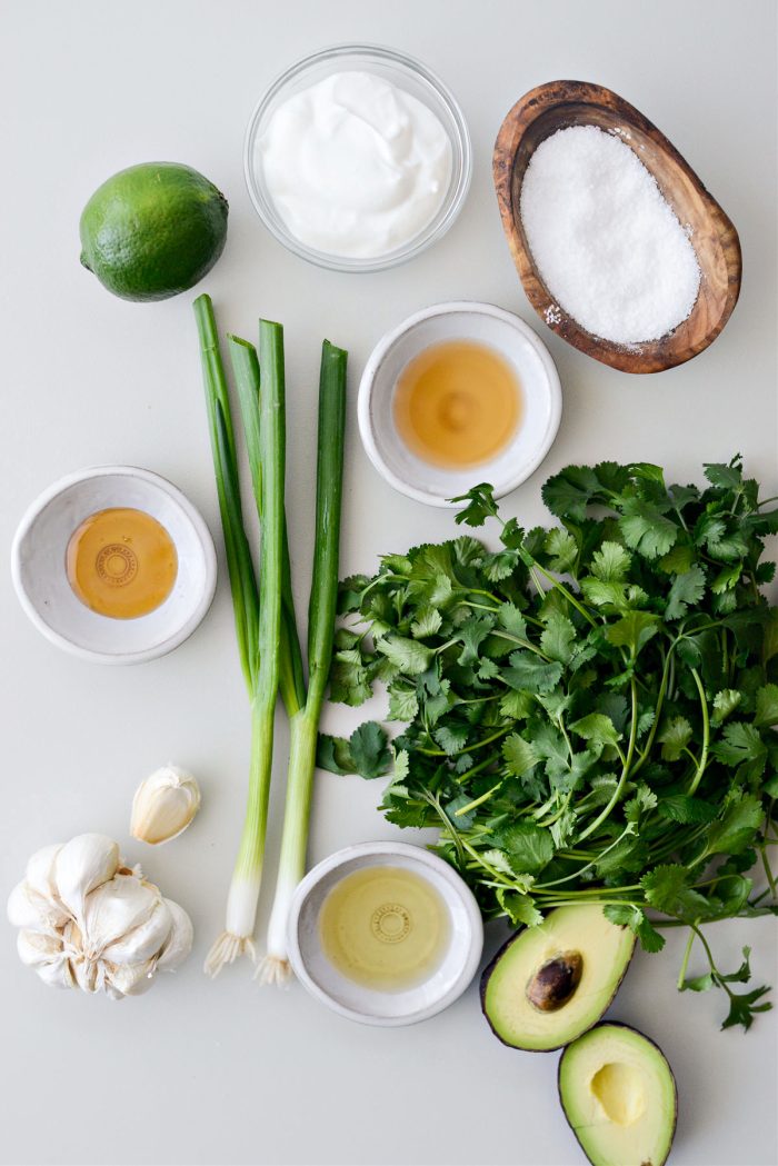 In a blender, add 1 cup cilantro (leaves and stems), 1/4 cup plain non fat greek yogurt, 1 small avocado, 2 chopped green onions, 1 large smashed and peeled clove of garlic, zest and juice of a medium lime, 2 tablespoons avocado oil, 1 tablespoon apple cider vinegar, 2 teaspoons honey and 1/2 teaspoon kosher salt.