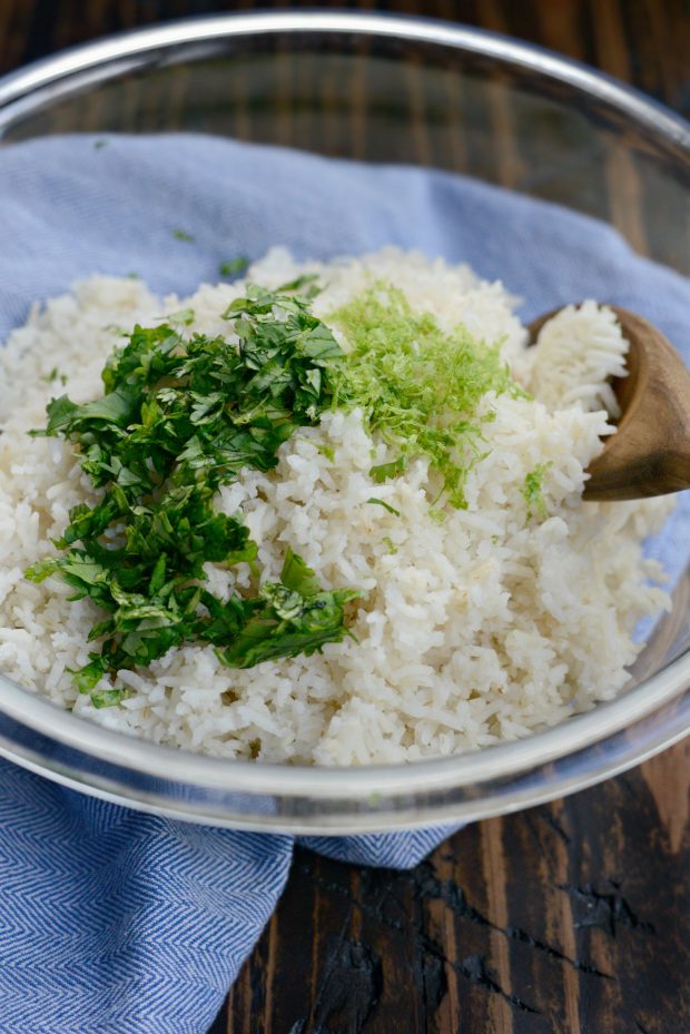 - Once the rice is cooked, fluff it up a bit with a fork. Then transfer it to a mixing bowl and add the finely chopped cilantro, lime zest, the juice of half a lime and 1 teaspoon olive oil.