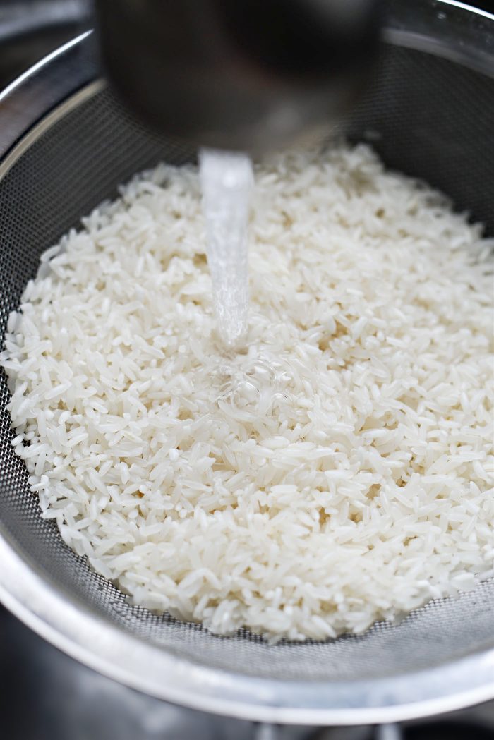 Most rice cookers come with their own specific measuring cup. With that said, using the measuring cup that comes with your rice cooker, measure and add 2 “cups” rice to a mesh strainer. Rinse with cool water, shaking the rice a little, until the water runs clear.
