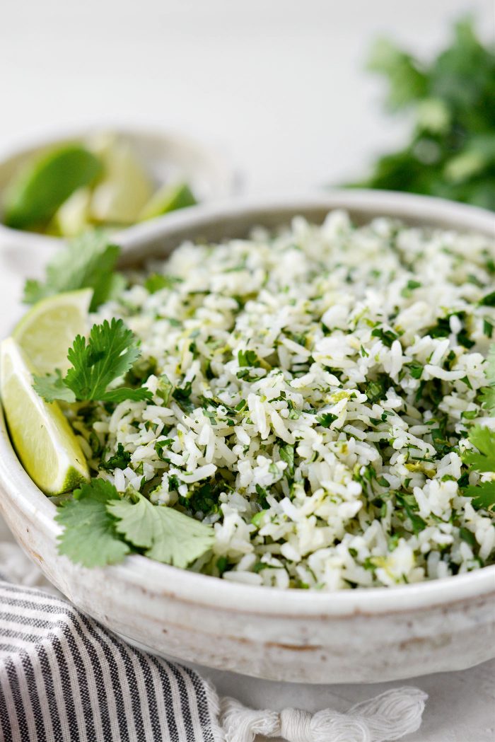 Besides using in burritos, enchiladas, tacos or in chicken or steak fajita bowls, below is a list of some flavorful main dishes to serve this incredible cilantro lime rice with.