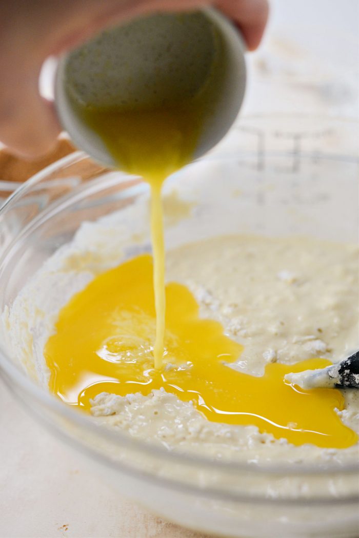 Pour in 1/4 cup melted and cooled unsalted butter.